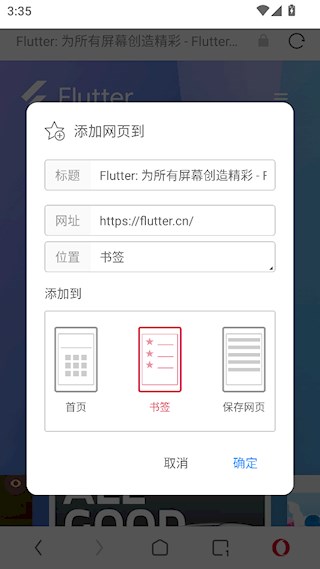 3、在【添加到】项中选择【书签】,然后点击【确定】;