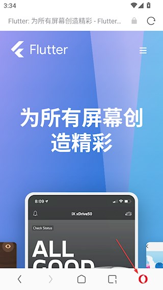2、进入浏览器后,点击右下角的红色“O”图标。